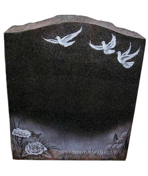 This funeral monument in black and serpentine form is polished facade and rustic on the sides. It offers a delicate landscape of doves, flowers and butterflies. A timeless classic.